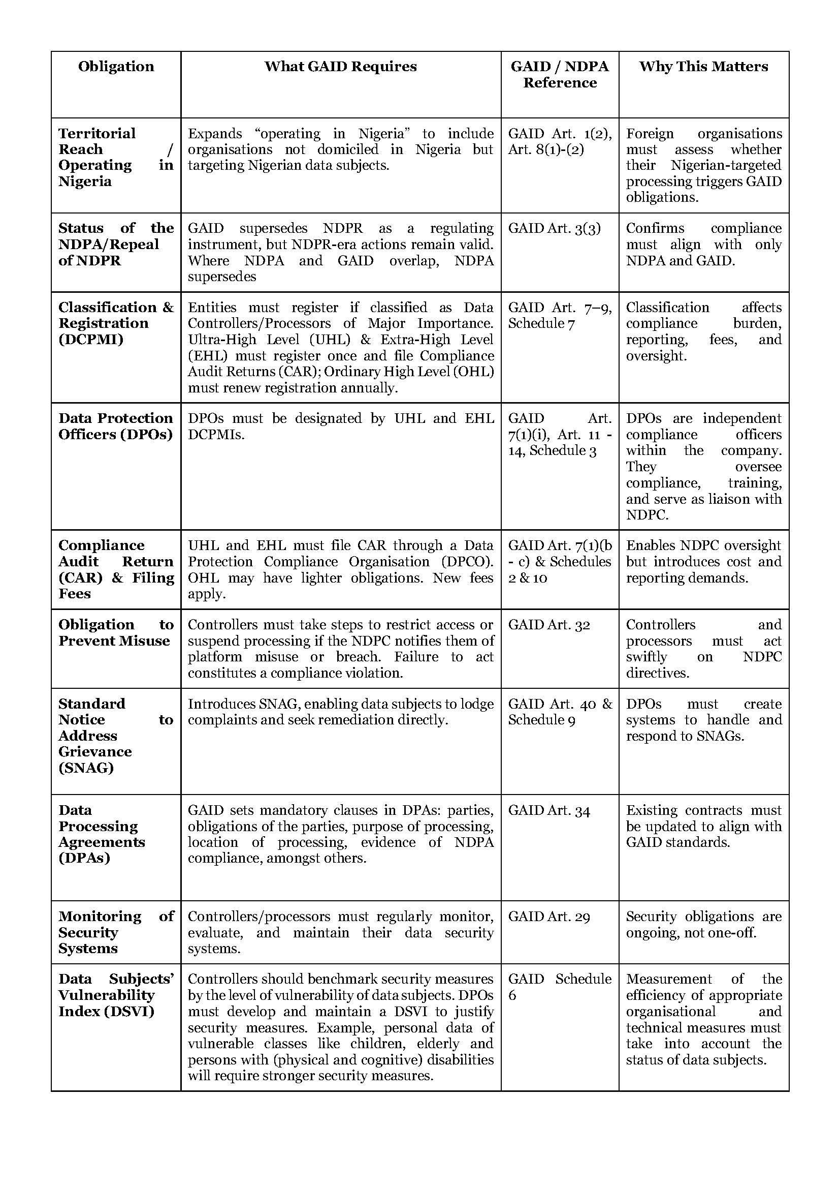The GAID 2025 represents a maturing of Nigeria’s data protection landscape. It brings clarity, harmonisation, and new burdens. For DPOs and compliance teams, the Directive is not optional guidance but a playbook for lawful operations in Nigeria.