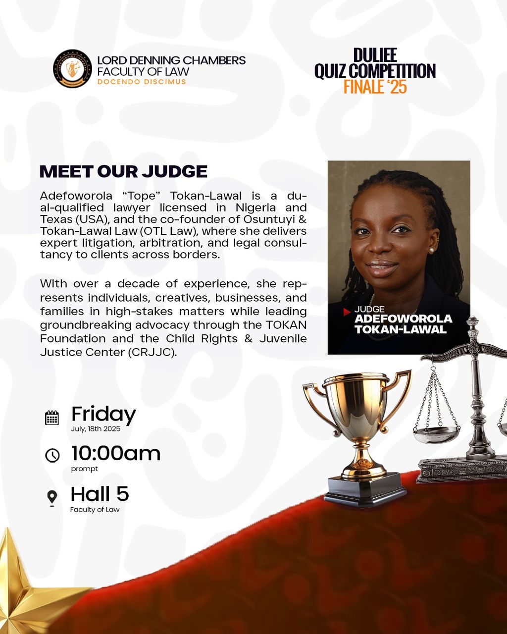 On Friday, 18 July 2025, our partner, A Tope Tokan-Lawal, served as Judge at the Grand Finale of the Duliee Quiz Competition, featuring The Bold & Briefed vs. Dominus Litus. This event marked the conclusion of the Mentorship Series 3.0, hosted by the Lord Denning Chambers LASU.